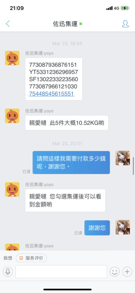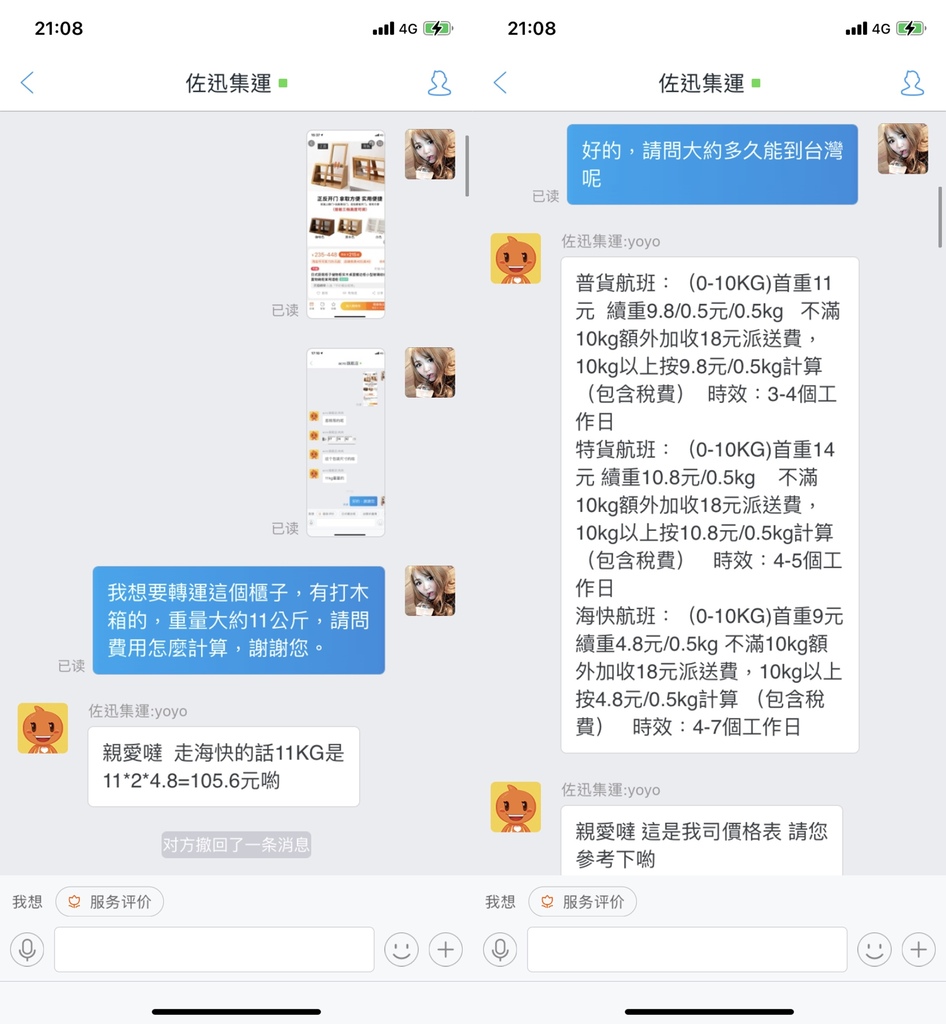 如果沒問題客服就會說明運費計算方式還有運送天數,詳細運費可參考佐迅集運運費![]()