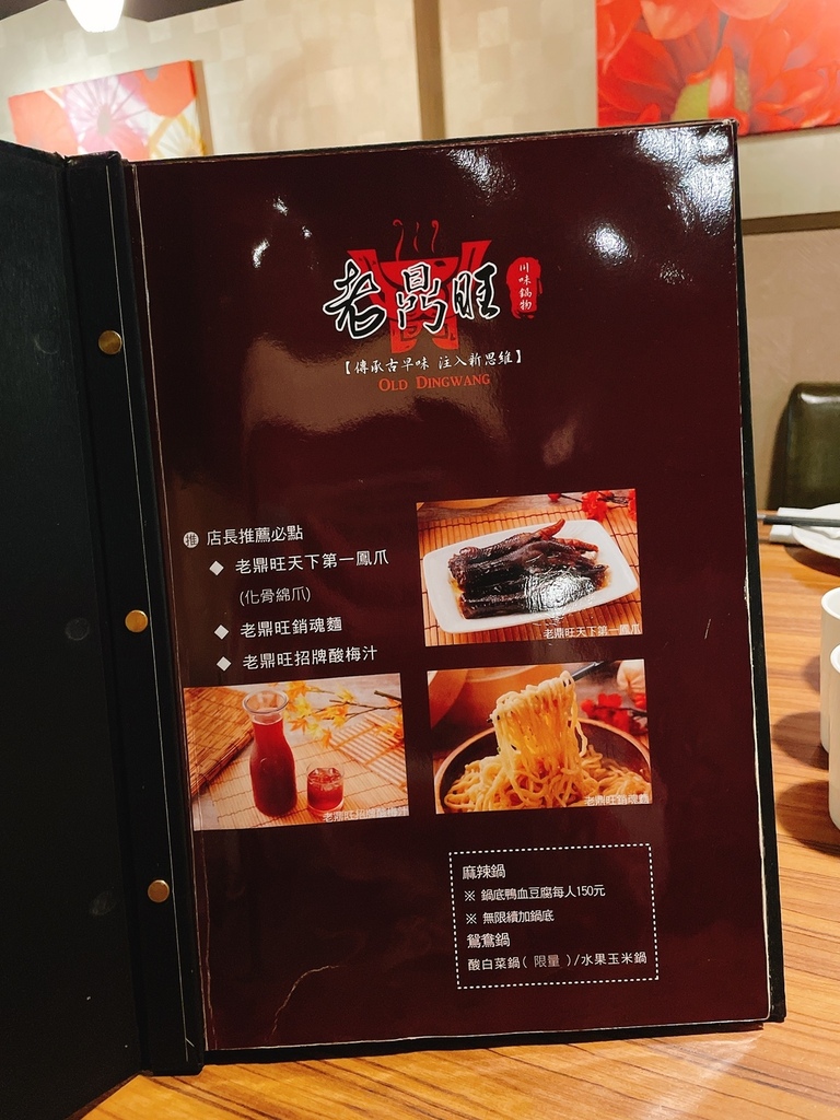 老鼎旺菜單一翻開就可以看到他們的招牌三寶「老鼎旺天下第一鳳爪、老鼎旺銷魂麵和老鼎旺招牌酸梅汁」