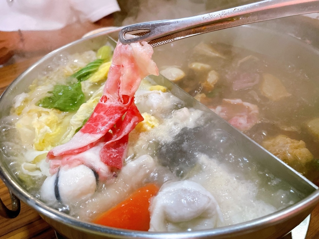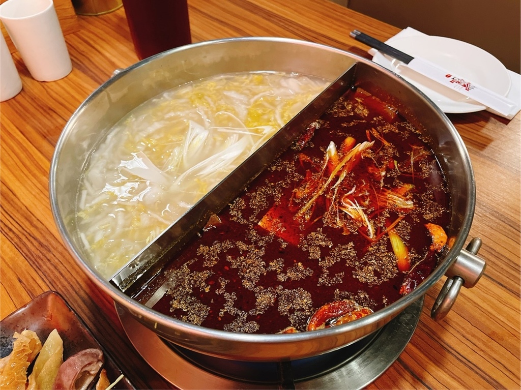 老鼎旺有幾種湯底可以選擇,我們選的是正宗四川麻辣湯和酸菜白肉湯底![]()