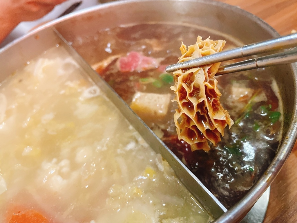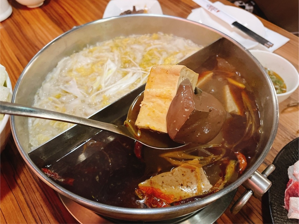 經典麻辣湯底辣度香氣十足麻而不辣,鍋底裡滿滿的鴨血豆腐相當入味,好涮嘴!