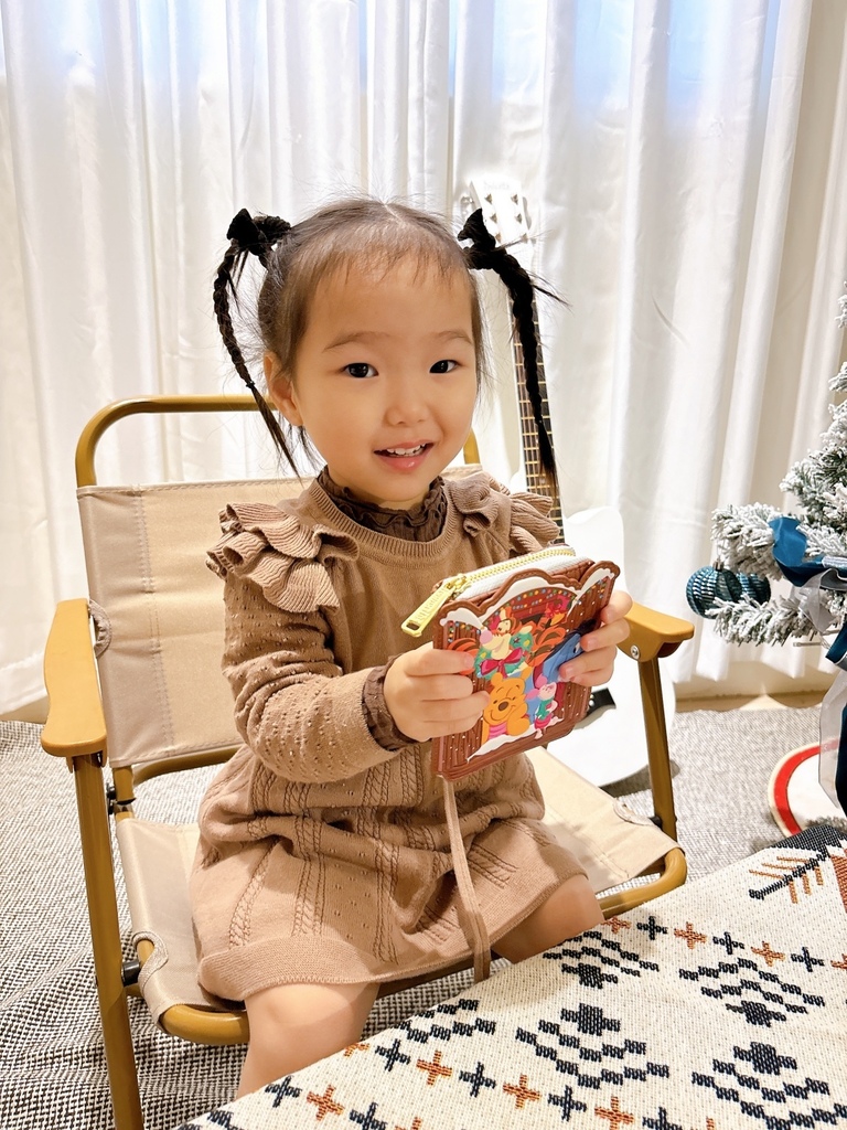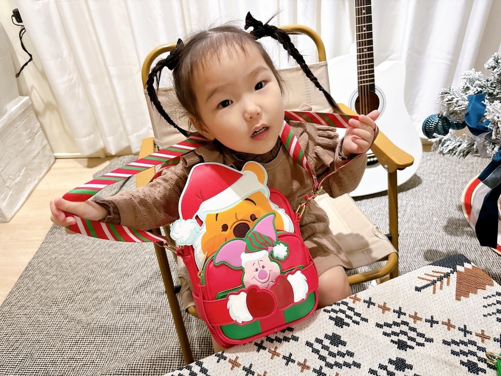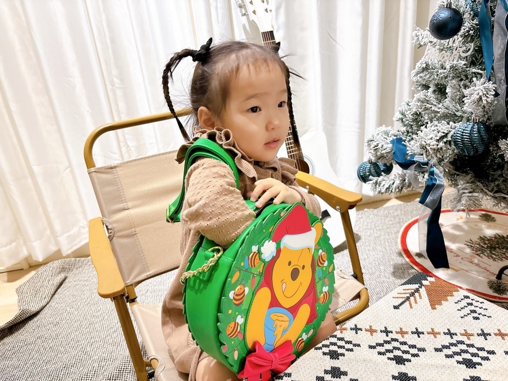 哈妮好喜歡這個小熊維尼聖誕側背包,一直說:我的,我的,這是我的 !