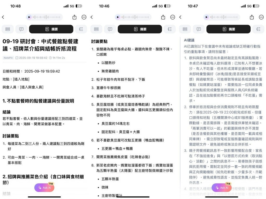 更厲害的是,它不只是轉文字,還會幫我自動整理成重點摘要,甚至給我 AI 的分析與提醒